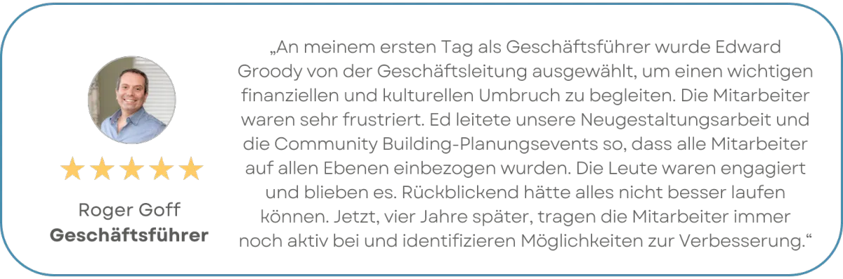Wir haben Teams und Organisationen mit den Prinzipien der „Authentischen Gemeinschaftsbildung“ durch Kommunikation, Offenheit, Fürsorge, emotionale Intelligenz, Zusammenarbeit und Vertrauen transformiert (wir werden genau erklären, was das während dieses EXKLUSIVEN Präsenz-Workshops bedeutet).